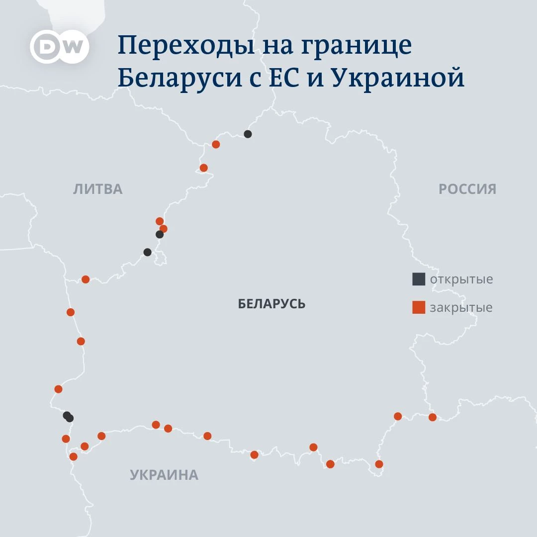 Четыре года назад из Беларуси в Евросоюз можно было попасть через 14 погранпереходов, сейчас – всего через пять, причем один из них открыт только для грузового транспорта, отмечает DW, показывая, как это выглядит наглядно.